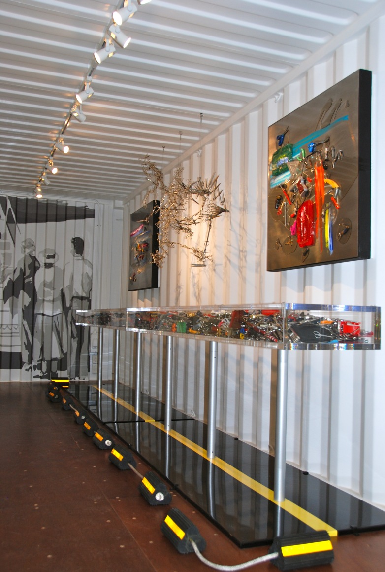 It is the latest from Maloney’s Banned Booty series from goods confiscated by the TSA post 911 from air-passenger’s carry-on luggage at 8 California Airports. The expansive piece is housed in a shipping container featuring works from the series while doubling as a canvas for a retro-style illustration of air passengers on the tarmac ready to board.