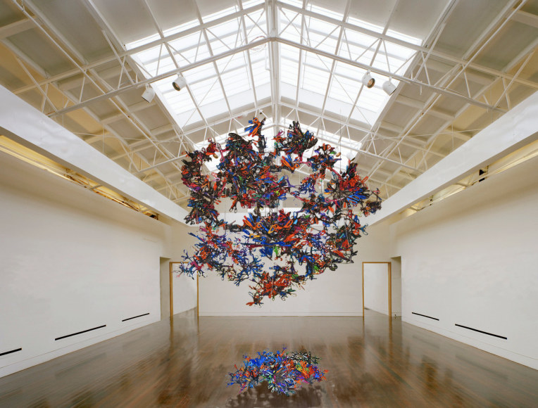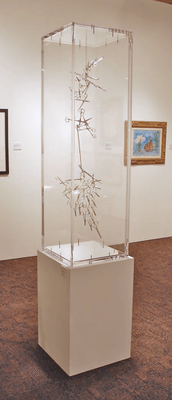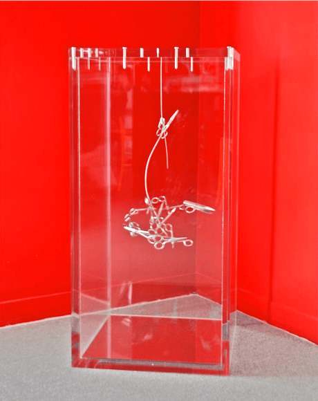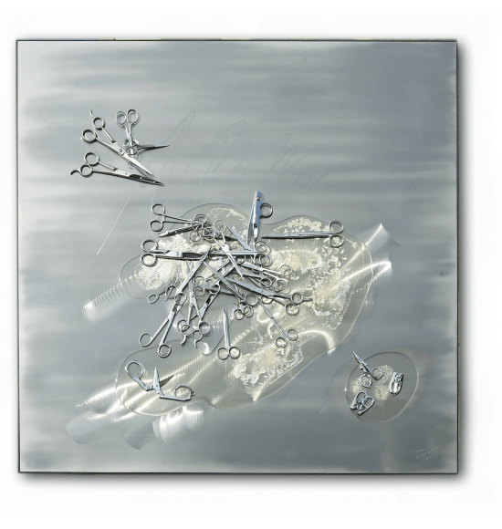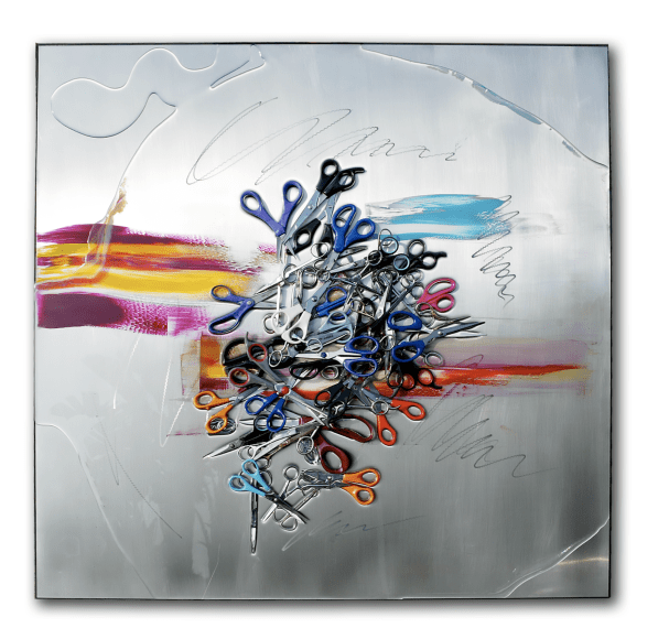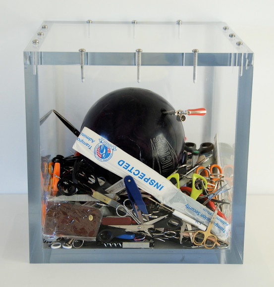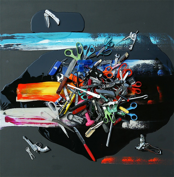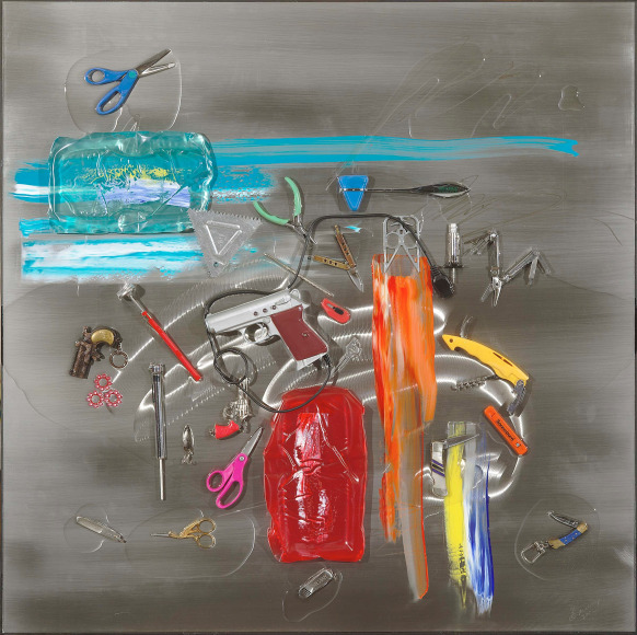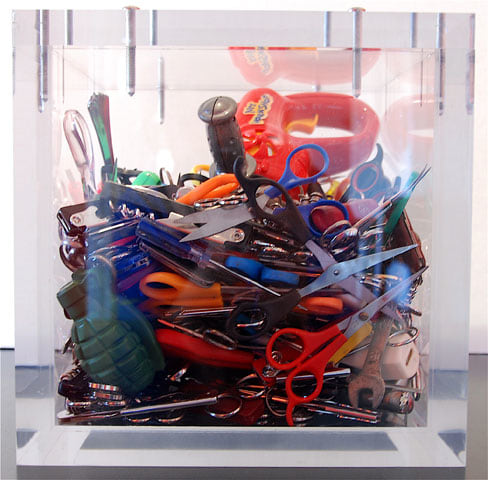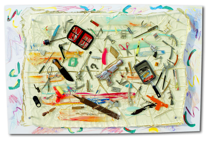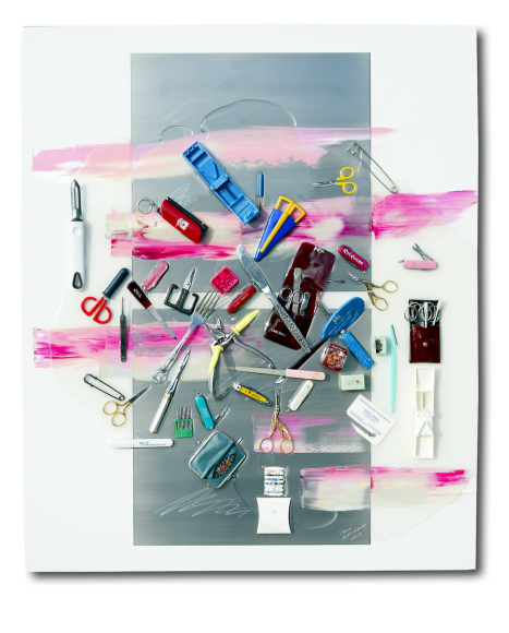 His "Banned Booty" installations are sculptural paintings consisting of mixed media, including actual items confiscated at airport security checkpoints, resin, acrylic, stainless steel and pigment on canvas.