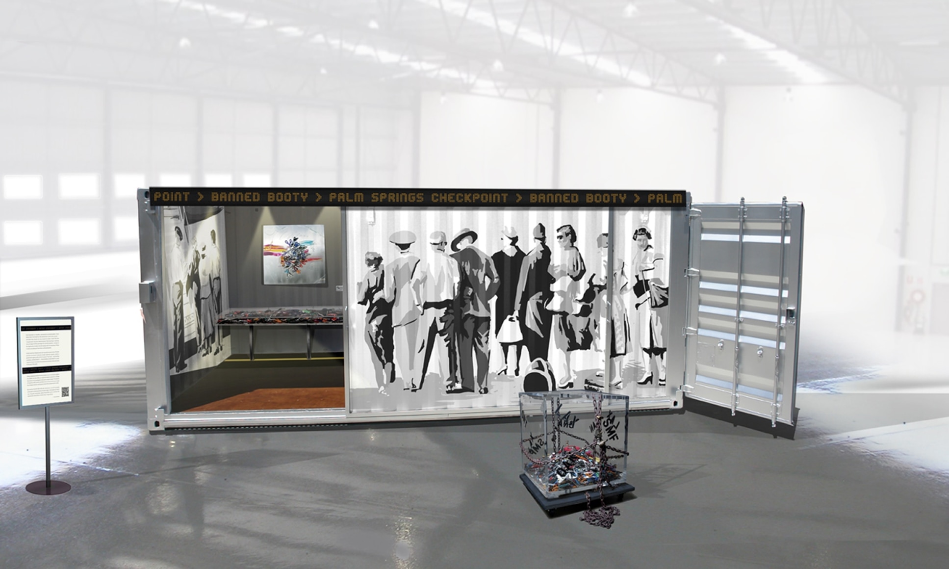 Using a shipping container not only enables him to conveniently mobilize his exhibit, but also offers an exquisite exterior canvas for a vintage illustration of air passengers on the tarmac ready to board.