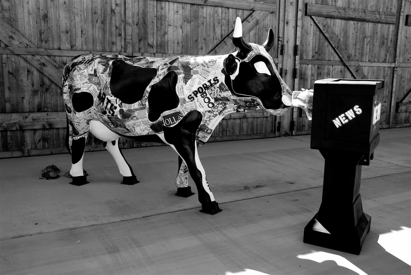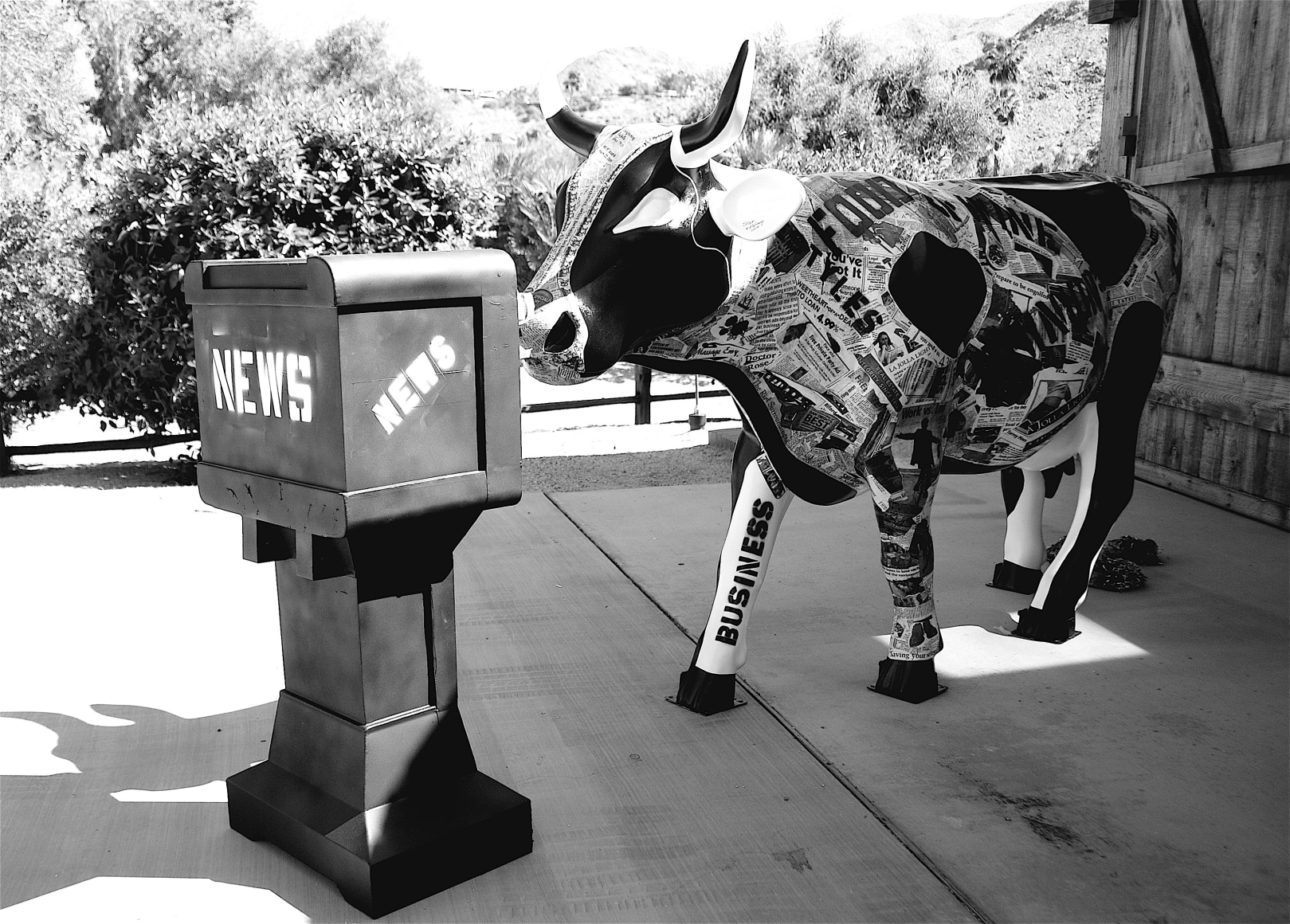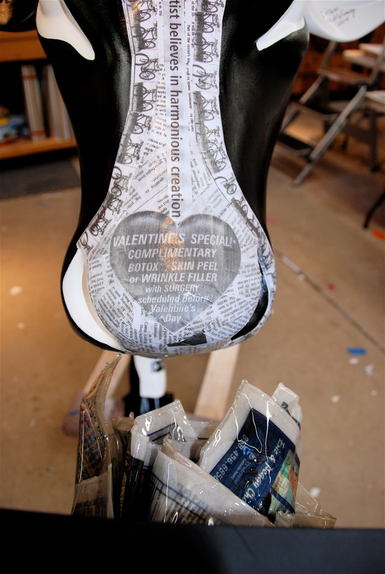 Digesting The News, is my bovine-shaped homage to newspapers. Crafted of a fiberglass, life-size cow, La Jolla Lightnewspaper collage,paints, varnishes, newspaper bundles, twine and a newspaper dispenser, the all-weather sculptural work will make its debut in the La Jolla Cow Parade.