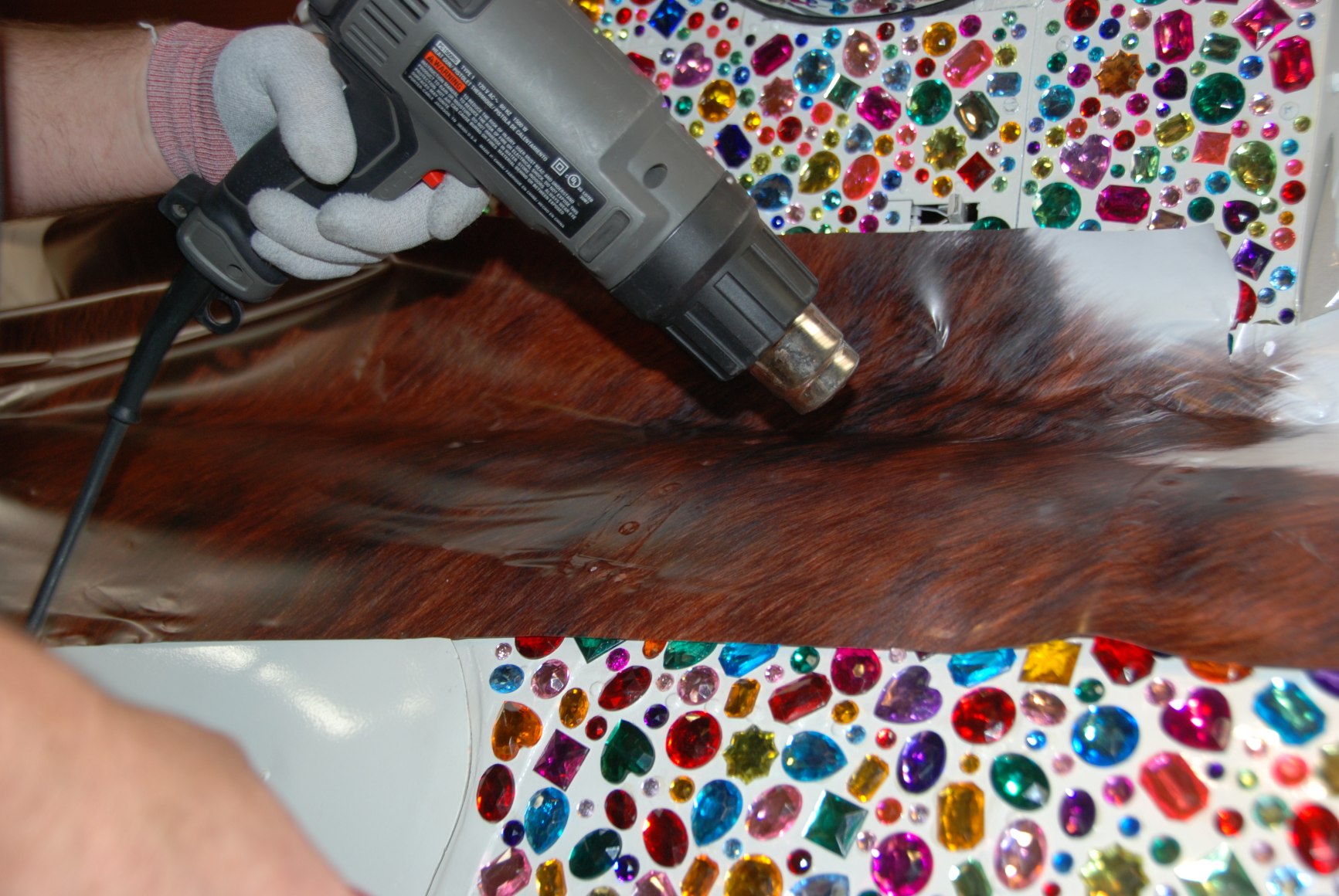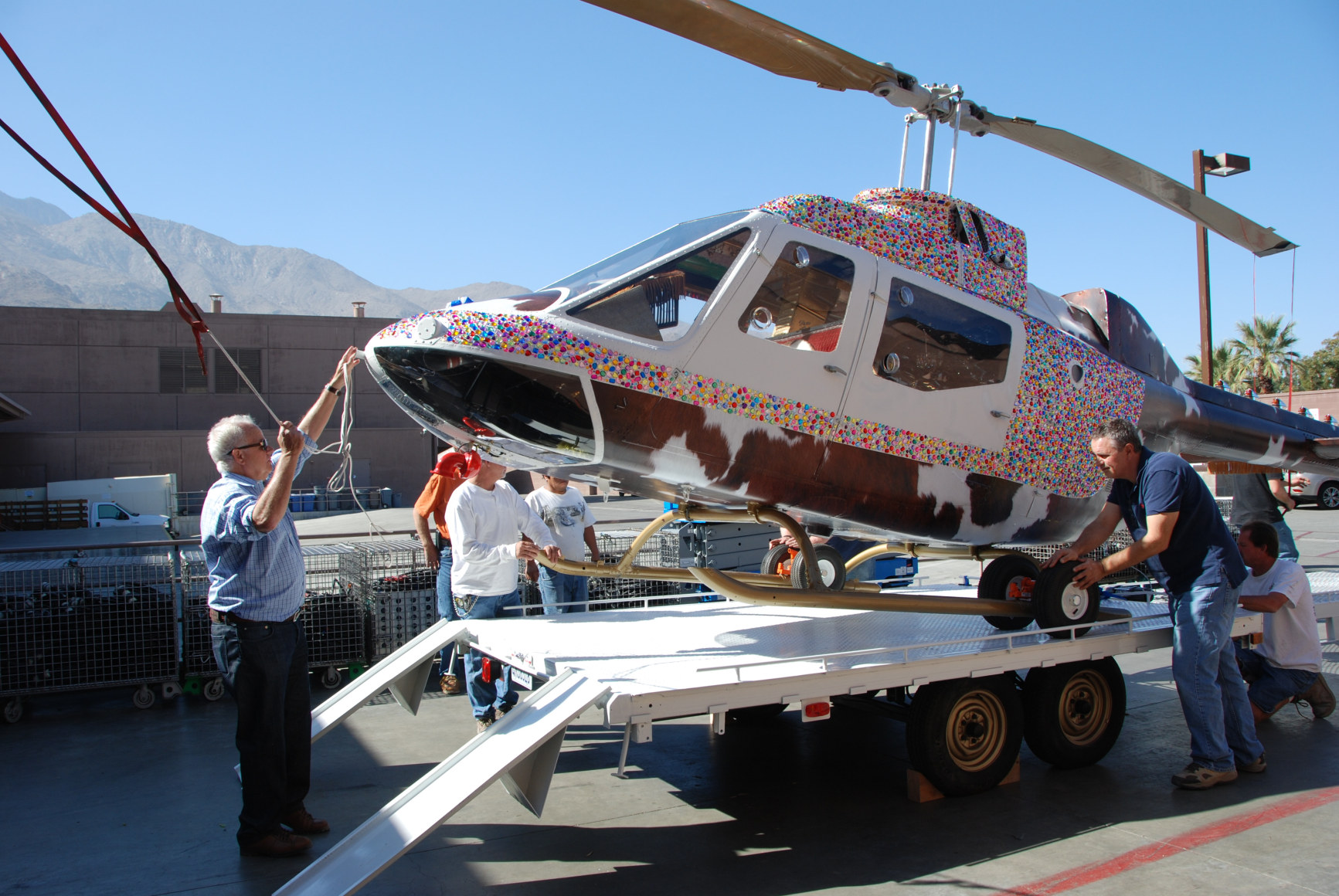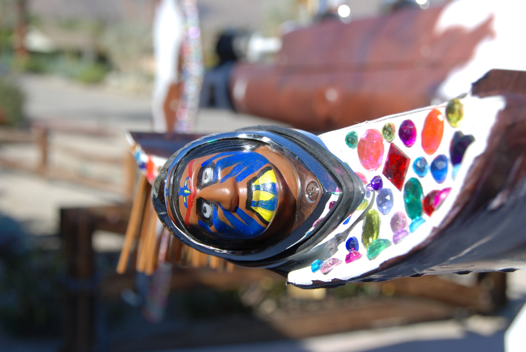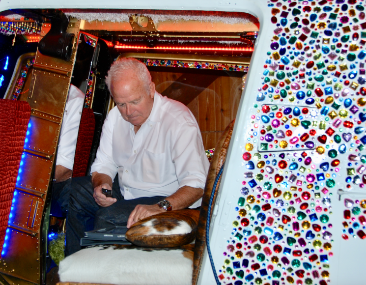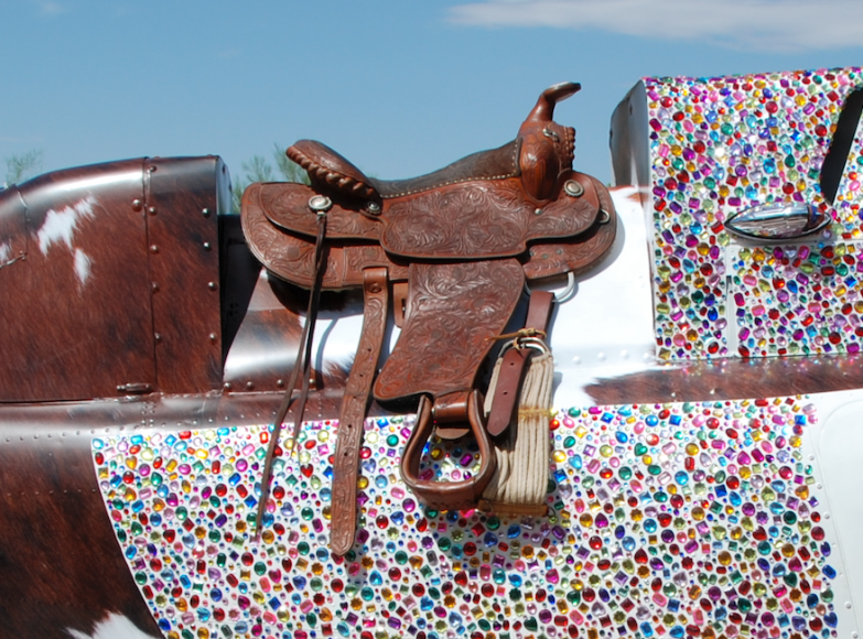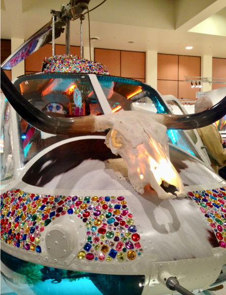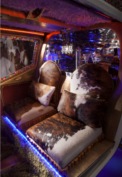 Using a decommissioned boneyard chopper, engine-free yet structurally sound, dressed to the hilt inside and out with thousands of colored gemstones; old cowhide chairs; authentic Longhorn Steer skull; iPad with virtual flight simulator; Swarovski crystal chandelier; a built-in high-polished lapped and riveted aluminum bar inspired by a vintage Airstream trailer; hand-war-painted Indian Motorcycle front fender lights; yards of LED lighting strips; and vinyl cowhide wrap exterior.