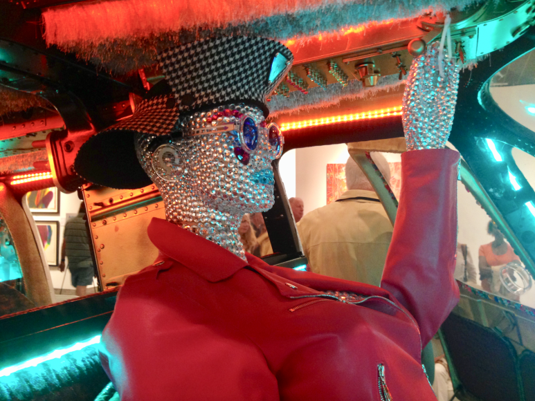 A well-worn western saddle previously ridden by Maloney’s father. Taken together, Ride-em-Copter is the perfect chariot for its well-endowed mannequin pilot, “Shivers,” whose persona bounded into the artist’s imagination and now sits surrounded by luxurious textiles including burgundy crocodile pattern mohair door panels, gold lizard skin trim, and green ever-so-shag carpet.