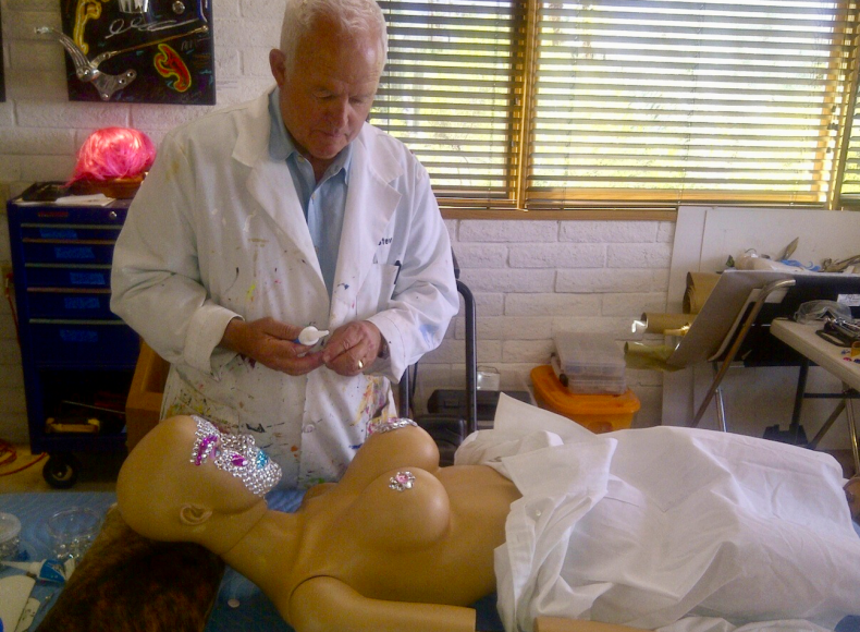 Maloney’s motivation for Ride-em-Copter was “to take viewers to the dazzling edge of my world of fun and excitement.” He recalls the horseback scene in Midnight Cowboy “with everything lit up similar to Glen Campbell’s lyrical illusion of a star-studded rodeo,” and imagines his ersatz pilot, Shivers, “opening her custom private luggage compartment, changing into dainty evening wear and jewelry, mixing herself a Pisco Sour without spilling a drop, and waiting for her Cowboy du jour to appear.”