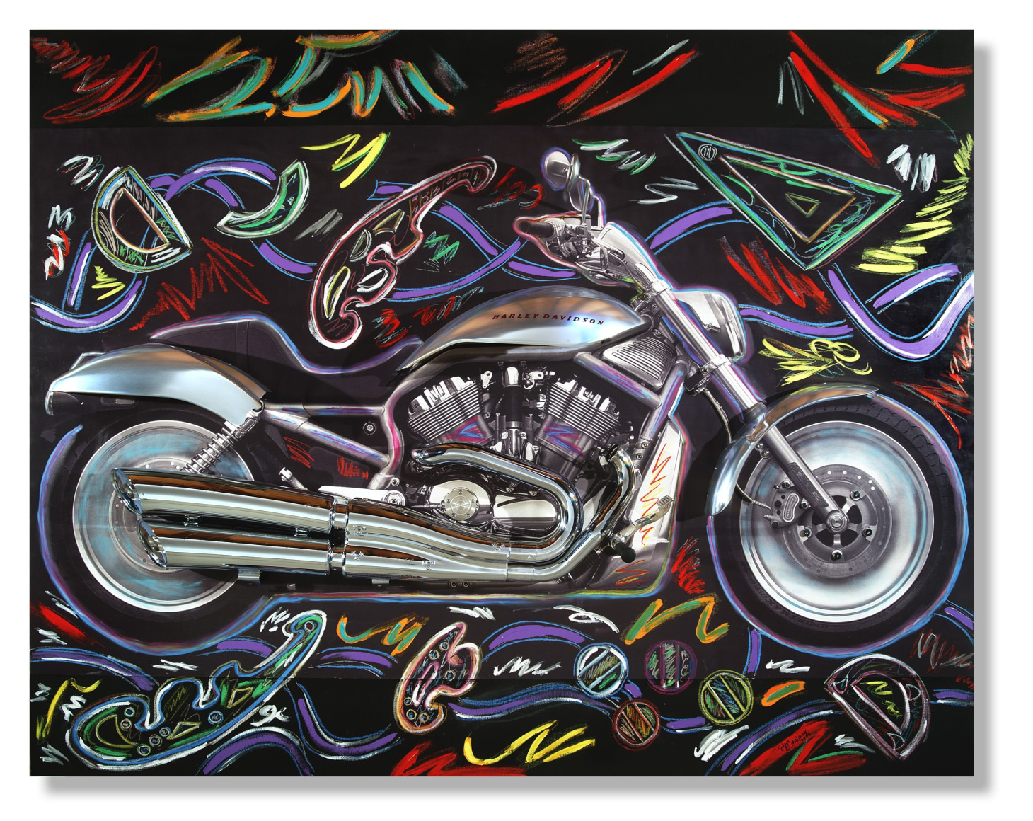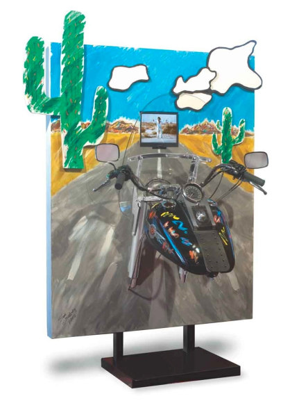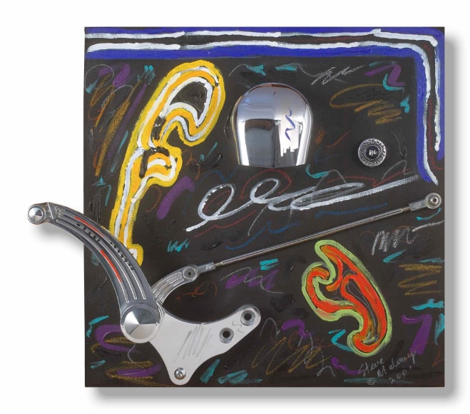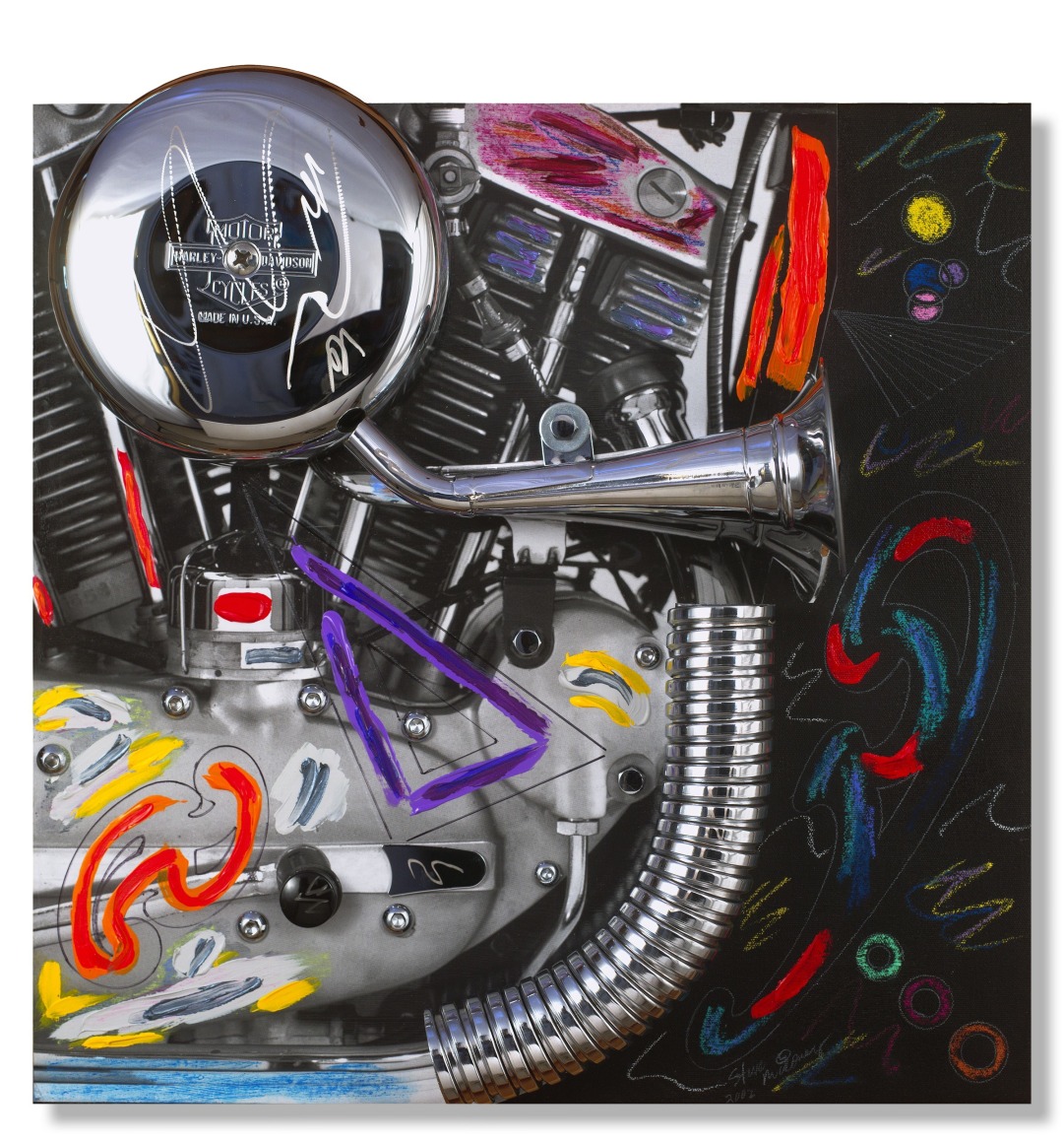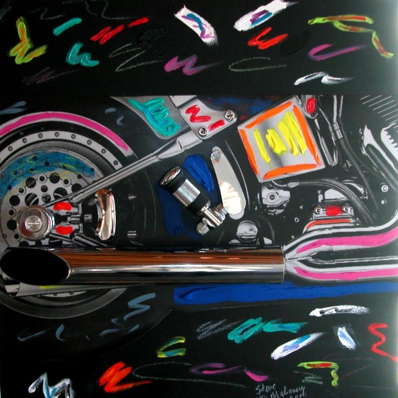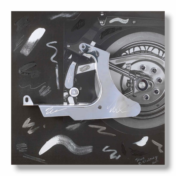 Maloney's sculptural-paintings, the "Vrooom" Series, was inspired by his love for and long-standing interest in machinery as an art form. To honor Harley-Davidson's® 100th Anniversary, Maloney incorporated classically designed motorcycle parts into uniquely expressive, visually exciting works. Building on the kinetic design of Harley-Davidson® parts, Maloney creates living, breathing, thundering impressions that quicken the observer's pulse.