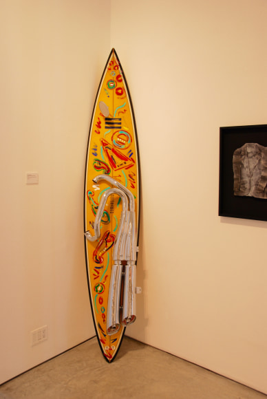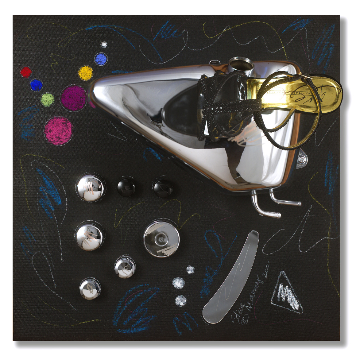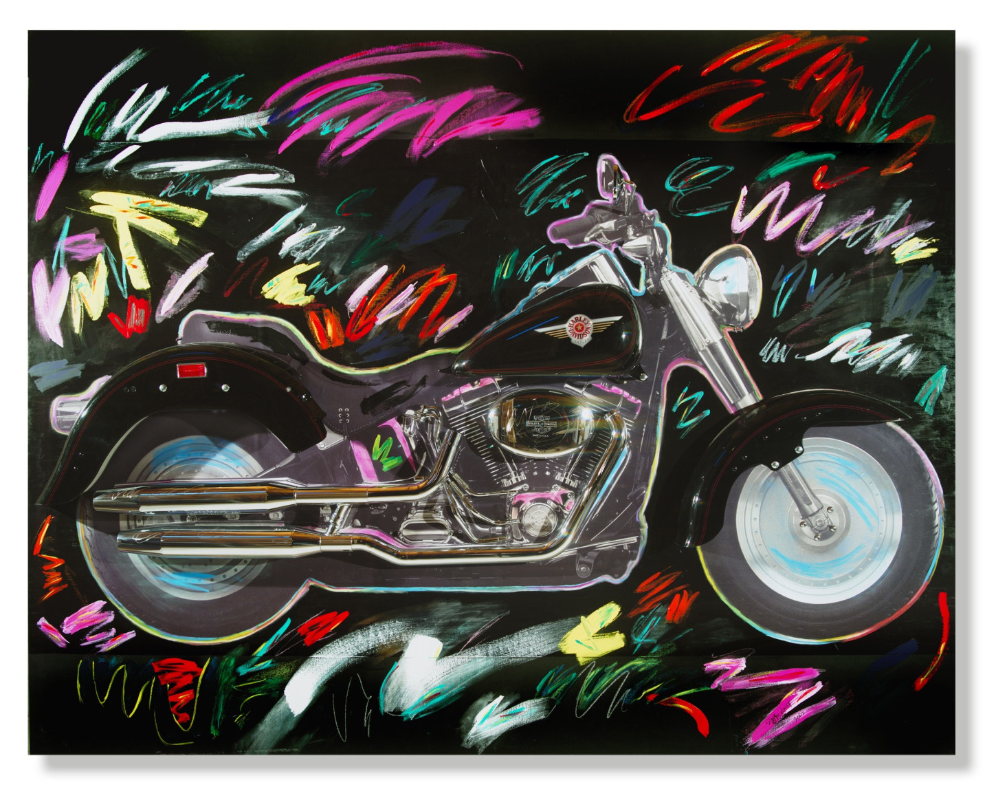 Maloney's sculptural-paintings, the "Vrooom" Series, was inspired by his love for and long-standing interest in machinery as an art form. To honor Harley-Davidson's® 100th Anniversary, Maloney incorporated classically designed motorcycle parts into uniquely expressive, visually exciting works. Building on the kinetic design of Harley-Davidson® parts, Maloney creates living, breathing, thundering impressions that quicken the observer's pulse.